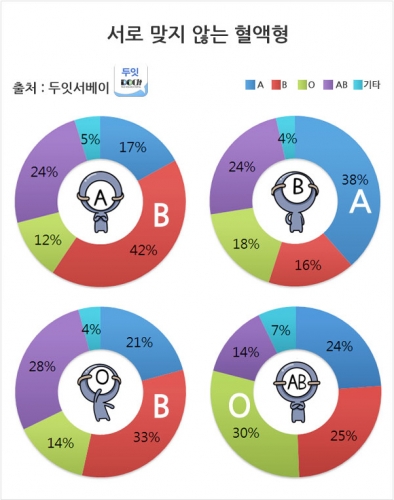 혈액형과 성격 간의 상관관계에 대한 논란이 여전한 가운데 궁합이 맞는 혈액형과 상극인 혈액형에 대한 재미있는 조사결과가 나왔다.