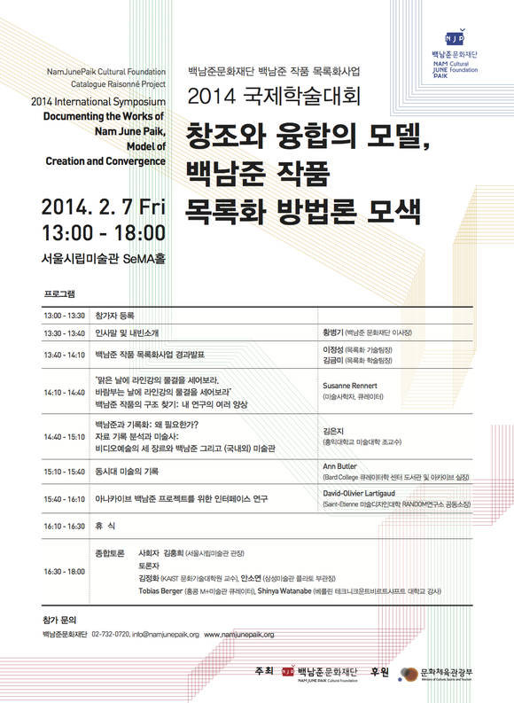 백남준문화재단(이사장 황병기)은 2014년 2월 7일에 서울시립미술관 SeMA홀에서 세계적인 석학들을 초대해 국제학술대회 <창조와 융합의 모델, 백남준 작품 목록화 방법론 모색>을 개최한다.