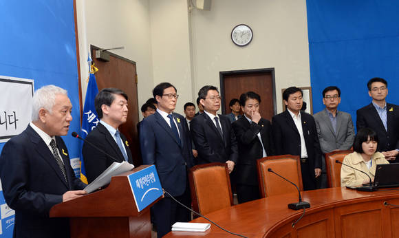 ▲새정치민주연합 김한길, 안철수 공동대표가 6일 여의도 국회대표실에서 세월호 참사 관련 기자회견을 갖고 "특검 포함한 진상규명을 위해 모든 수단과 방법을 고려해야한다"고 이야기 하고 있다.(사진=새정치민주연합)