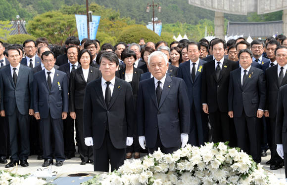 ▲새정치연합 김한길,안철수 공동대표,박영선 원내대표를 비롯한 새정치민주연합 지도부,윤장현 광주시장 후보,이낙연 전남지사 후보,시 도의원후보,당원들과 함께 광주 북구 운정동 국립 5·18민주묘지 참배 및 '님을 위한 행진곡'을 부르고 있다.(사진=새정치민주연합)