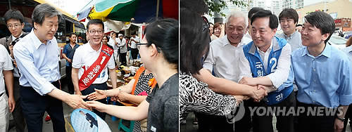 ▲여야 지도부가 18일 오전 7·30 재·보선 격전지 중 하나인 경기 김포를 방문해 시민들에게 지지를 부탁했다. 왼쪽은 새누리당 김무성 대표가 통진읍 서암리 일대에서 홍철호 후보의 지지를 오른쪽은 새정치민주연합 김한길,안철수 공동대표가 풍무동 일대에서 김두관 후보를 지지를 호소하고 있다.(사진=연합뉴스)