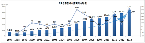 (CNB=한현지 기자) 울산시는 광역시 승격 당시 외국인 인구가 3,418명에서 2013년 2만 2,427명으로, 연평균 1,188명씩 꾸준히 증가하고 있는 것으로 나타났다.