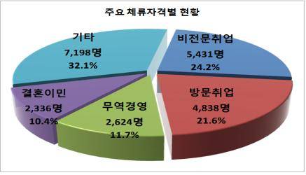 국적별 현황으로는, 중국인이 8,733명(38.9%)으로 가장 많았고, 베트남 2,925명(13.0%), 필리핀 1,159명(5.2%), 미국 1,068명(4.8%) 등으로, 주로 동남 아시아권 국가의 외국인들이 57.1%로 절반 이상을 차지하고 있는 것으로 조사됐다.