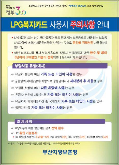 또한, 복지카드를 부당사용하게 되면 지원받은 LPG보조금 환수는 물론, 사용횟수와 금액에 따라 최소 3개월에서 최대 5년까지 LPG복지카드 할인기능이 정지된다.