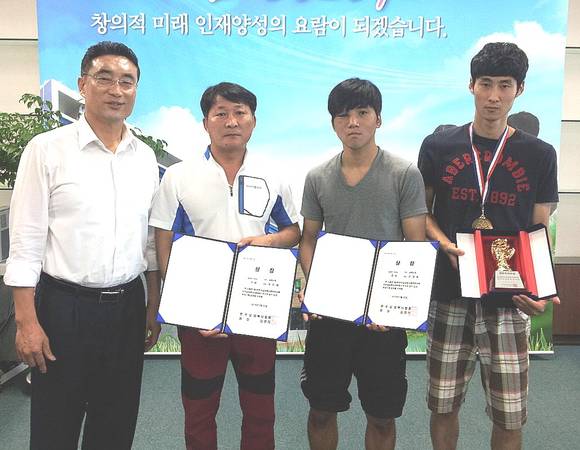 ▲박영일 남해군수와 함께 김봉철 감독, 전영환 선수, 주민재 선수가 남해군수실에서 기념촬영을 하고 있다.