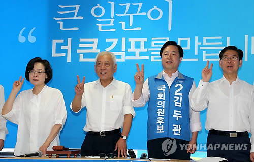 ▲새정치민주연합 김한길 공동대표와 지도부가 28일 오전 김포시 고촌읍 신곡리 7·30재보궐선거 김포에 출마한 김두관 후보 선거사무소에서 열린 최고위원회의에서 파이팅하고 있다.(김포=연합뉴스)