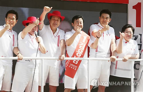 ▲새누리당 김무성 대표 등 지도부가 29일 경기 수원시 팔달구에서 김용남 수원병 국회의원 후보와 함께 유세차에서 지지를 호소하고 있다. 왼쪽부터 함진규 경기도당 위원장, 이인제 최고위원, 김무성 대표, 김용남 후보, 김태호, 김을동 최고위원.(수원=연합뉴스)
