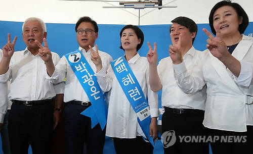 ▲7·30 국회의원 재·보궐선거를 하루 앞둔 29일 오전 경기도 수원시 영통구 새정치민주연합 천막 선거상황실에서 국회의원, 도의원 연석회의가 열려 김한길 공동대표, 수원정 박광온 후보, 수원을 백혜련 후보, 안철수 공동대표, 박영선 원내대표(왼쪽부터) 등 참석자들이 기호2번 지지를 호소하고 있다.(수원=연합뉴스)