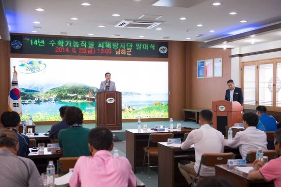 이날 발대식에서 피해방지단 대표의 선서, 박영일 남해군수의 인사말에 이어 남해군은 농작물 피해방지단 운영계획을 단원들에게 주지시켰으며, 남해경찰서에서는 총포 관련 안전교육을 실시했다. 또 육군 제8962부대는 야간 피아 식별방법을 교육하고 군 작전 구역 및 시기를 안내했다.