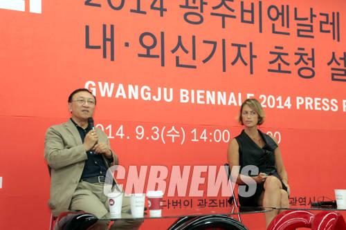 3일 오후 광주광역시 광주비엔날레 거시기홀에서 2014 광주비엔날레 내외신기자 초청 설명회가 열렸다. 이날 자리를 함께한 이용우 (재)광주비엔날레 이사장이 인사말을 하고 있다.