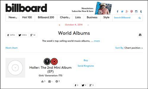 26일 빌보드에 따르면 지난 16일 공개된 태티서의 두 번째 미니앨범 ‘할러’(Holler)는 월드 앨범 차트(10월 4일자)에서 1위를 기록했다.