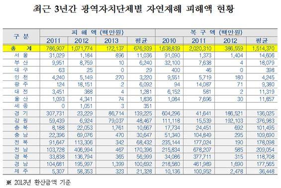 지역별로는 서울부산 등 8개 특광역시 평균 피해액은 301억원으로 전국 피해액 대비 4%에 불과했다.