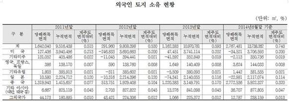 국가별로 보면 중국 국적 외국인이 총 5.92㎢를 취득해 1위를 차지했고, 이어 미국 3.7㎢, 일본 2.1㎢, 기타 국가 1.9㎢ 순으로 조사됐다.