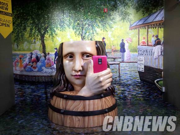 사진은 새로 전시된 작품 중 하나인 마네와 모나리자가 만난 '아르장퇴유의 배 위에서 그림을 그리는 모네'이다. 통통배를 타고 핸드폰을 들고 있는 모나리자가 카메라 플래시 불빛이 터질 때 '윙크' 소리를 내며 눈을 깜빡이는 모습이 인상적이다.