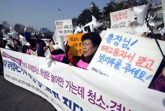 19일 서울 서대문구 연세대학교 앞에서 민주노총, 전국여성노조 조합원들이 지난해 말 연세대 송도 국제캠퍼스에서 구조조정으로 재계약 되지 않은 23명 청소, 경비노동자들의 고용승계를 보장할 것을 촉구하며 기자회견을 하고 있다.(사진=연합뉴스)