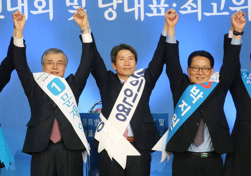 ▲31일 오후 서울 중구 장충동 장충체육관에서 열린 새정치민주연합 서울시당 정기대의원대회 및 당대표·최고위원 후보자 합동연설회에서 후보자들이 손을 맞잡고 포즈를 취하고 있다. 왼쪽부터 문재인, 이인영, 박지원 후보.(사진=연합뉴스)