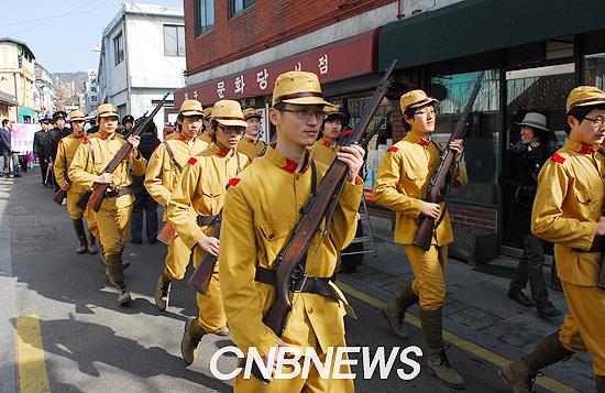 제89회 3.1절을 맞아 열린 3·1 독립만세운동 기념식에서 중앙고 학생들이 일본 순사 복장을 하고 거리행진을 하고 있다.