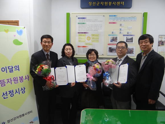 (CNB=최성락 기자) 정선군자원봉사센터(소장 안중균)는 24일 정선군자원봉사센터에서 이달의 으뜸봉사자·으뜸봉사단체에 대한 시상을 가졌다. 정선군자원봉사센터는 자원봉사 마일리지제 운영에 따라 성실하게 자원봉사활동을 실시한 봉사자와 단체 중 월별 활동실적이 우수한 수상자를 각각 선정해 월별 시상식을 갖는다. 이달의 으뜸봉사자는 최해숙 북평여성의용소방대장과 김경남 아라리서금봉사단 총무가 선정됐으며 으뜸봉사단체는 남면의용소방대와 정선청년봉사단이 선정됐다. 으뜸봉사자와 으뜸봉사단체 선정은 독거노인 및 소외계층 재가방문 활동, 농촌일손돕기, 지역사회봉사, 교통안전지도 등 다양한 분야에서 활동실적을 인증받아 선정되며 부상으로 인증서와 농산물상품권이 지급된다.