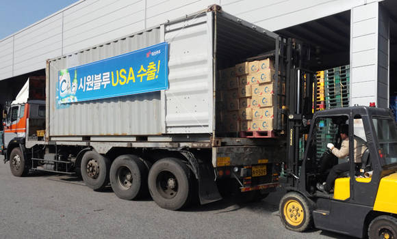 ▲‘시원블루’가 미국행 컨테이너 박스에 실리고 있는 모습. (사진제공=대선주조)
