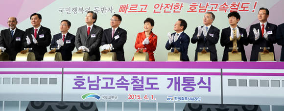 왼쪽부터 하미드 말레이시아 육상교통위원장, 박기춘 국회 국토교통위원장, 강영일 한국철도시설공단 이사장, 새누리당 김무성 대표, 유일호 국토교통부 장관, 박 대통령, 윤장현 광주시장, 새정치민주연합 문재인 대표, 백상수 주민 대표, 홍문표 국회 예산결산특별위원장.(사진=연합뉴스)