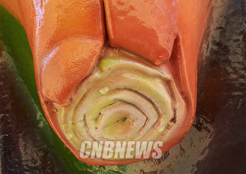 ▲손가락으로 조형물을 살짝 눌렀더니 여기저기 구멍이 나고 하얀 액체가 흘러나왔다.(사진=CNB포토뱅크)