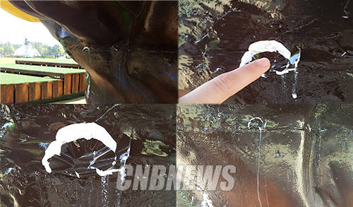 23일 CNB가 취재한 결과, 이 조형물의 위쪽에서는 원인을 알 수 없는 물이 떨어지고 있었다. 뿐만 아니라 나무 둘레는 손가락으로 살짝만 눌러도 구멍이 나면서 군데군데 하얀 액체를 드러냈다.