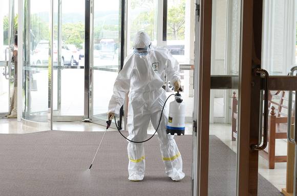 ▲메르스 확진 판정을 받은 141번 환자가 확진 판정을 받기 전인 지난 5∼8일 3박 4일간 제주 여행 중 숙소로 이용했던 서귀포시 중문관광단지 신라호텔에서 18일 보건당국이 메르스 확산을 막기 위한 소독 작업을 하고 있다. (사진제공=연합뉴스)
