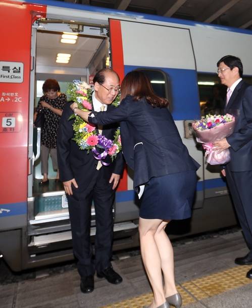 ‘세계 해양대통령’으로 불리는 국제해사기구(IMO)에서 첫 한국인 사무총장이 된 임기택 사무총장 당선인이 3일 오전 부산역 플랫폼에서 환대를 받고 있다.