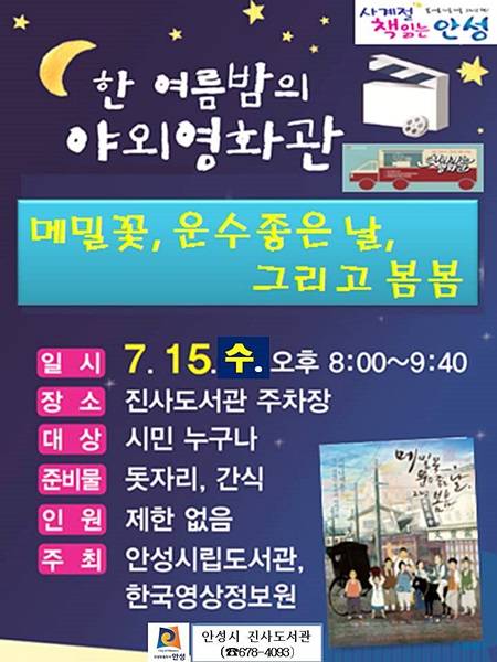 안성시는 오는 15일 저녁 8시 진사도서관 야외주차장에서 한여름밤의 야외영화관을 운영한다고 밝혔다.