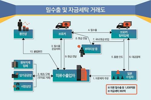 부산경남본부세관은 관세청과 함께 2013년 5월부터 2년간 단속한 결과, 수백 명의 밀수출대금을 외국인 여권사본으로 반입한 의류 수출업자, 운송자 및 브로커, 환전상 등 총 91명을 검거했다.