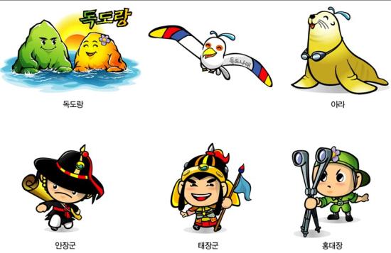 앞으로 문화콘텐츠 사업을 통해 독도를 수호하게 될 캐릭터는 독도의 동·서도를 의인화한 기본캐릭터 1종, 역사적 인물 및 강치, 괭이갈매기를 활용한 보조캐릭터 5종을 포함하여 총 6종을 개발하였다.