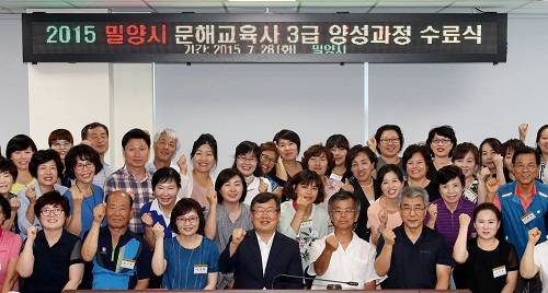 밀양시(시장 박일호)는 28일 밀양시 CCTV통합관제센터 종합상황실에서 시 관계자와 (사)한국문해교육협회 관계자, 수료생 등 50여 명이 참석한 가운데 문해교육사 3급 양성과정 수료식을 가졌다.