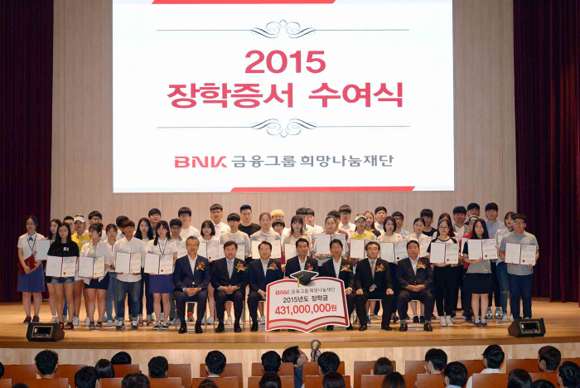 BNK금융그룹 희망나눔재단(이사장 성세환)이 19일 오전 부산은행 본점 대강당에서 2015년도 'BNK 행복한 장학금 수여식'을 갖고 470여명의 지역 대학생, 고등학생을 선발, 총 4억3천여만 원의 장학금을 전달했다.