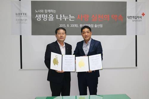 롯데백화점 울산점(점장 현종혁)은 지난 20일 롯데백화점 울산점에서 적극적인 지역 내 사랑 나눔의 실천과 기업체 헌혈문화 정착을 위해 대한적십자사 울산혈액원(원장 김인호)과 '생명을 나누는 사랑의 실천' 약정식을 했다.