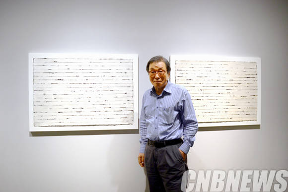 ▲'평면조건' 연작과 함께한 최명영 작가.(사진=더페이지갤러리)