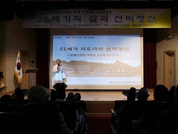 함양군과 (사)일두기념사업회는 물레방아축제 이튿날인 18일 오후 2시 문화예술회관 소공연장에서 유도회회원, 각급학교장, 선비문화연구회 회원, 일두기념사업회 회원, 군민 등 200여명이 참석한 가운데 '21세기의 삶과 선비정신'강연회를 개최했다.