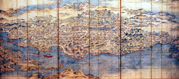 ▲히데요시가 조선 침략을 앞두고 6개월만에 지었다고 하는 히젠나고야 성의 웅장한 모습을 담은 병품 그림. 히데요시 당시 일본에 머물렀던 포르투갈 선교사 루이스 프로이스는 이 성에 대해 “모두 금빛으로 칠해져 있었다. 넓은데도 완성하는 데 단지 6개월밖에 걸리지 않는다는 사실이 놀랍다”고 기록했다.(사진=위키피디아)