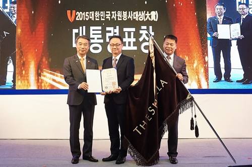 호텔신라가 제10회 자원봉사자의 날(12월 5일)을 기념해 서울 벨라지움 컨벤션에서 열린 ‘2015 전국자원봉사자대회’에서 기업부문 최고상인 ‘대통령 표창’을 수상했다고 6일 밝혔다.