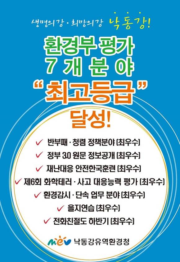 낙동강유역환경청은 반부패·청렴 정책 분야, 정부 3.0 원문 정보공개, 재난대응 안전한국훈련, 화학테러·사고 대응능력 평가, 환경감시·단속 분야, 을지연습, 전화친절도 등 총 7개분야 평가에서 환경부 소속(산하)기관 중 최우수를 획득했다.