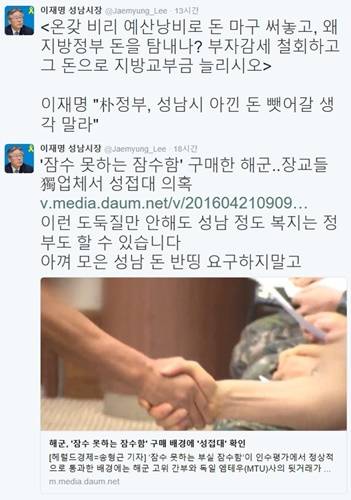 이 시장은 지난 24일 자신의 트위터에 정부의 “‘잠수 못하는 잠수함’ 구매한 해군, 장교들 獨업체서 성접대 의혹”이라는 기사를 링크한 후 “이런 도둑질만 안 해도 성남 정도 복지는 정부도 할 수 있다. 아껴 모은 성남 돈 반띵 요구하지 말고”라고 지적했다.