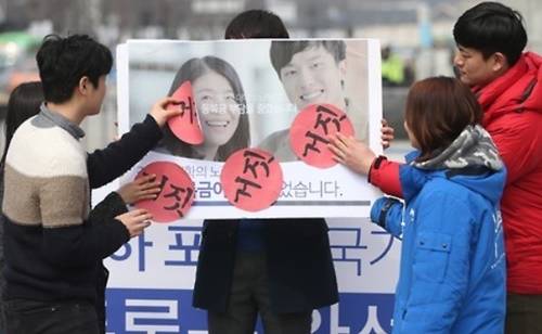 ▲정부의 ‘국가장학금’과 대학생들이 생각하는 ‘반값등록금’은 차이가 많아 보인다. 서울지역 대학 총학생회 소속 대학생들이 지난 3월 3일 서울 종로구 광화문 광장에서 “정부의 ‘반값등록금 완성’ 방송광고가 거짓”이라며 실질적인 반값등록금의 실현을 촉구하는 기자회견을 마치고 퍼포먼스를 하고 있다. (사진=연합뉴스)