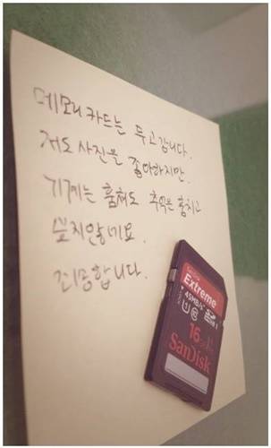 해당 사진에는 “메모리 카드는 두고 갑니다. 저도 사진은 좋아하지만, 기계는 훔쳐도 추억은 훔치고 싶지 않네요. 죄송합니다”라는 한 장의 메모지와 함께 카메라에 있었던 것으로 보이는 메모리 카드가 놓여 있다.