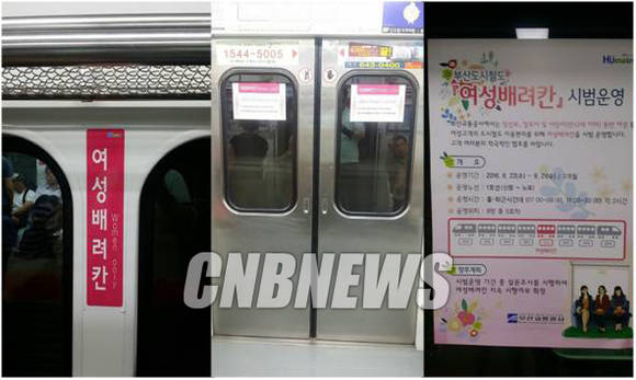 부산시는 지난달 22일부터 출근 시간인 오전 7~9시, 퇴근 시간인 오후 6~8시에 운행하는 지하철 1호선 8량 중 5번째 칸을 여성만 탈 수 있도록 운행하고 있다. 국내에서는 처음 있는 일이다.