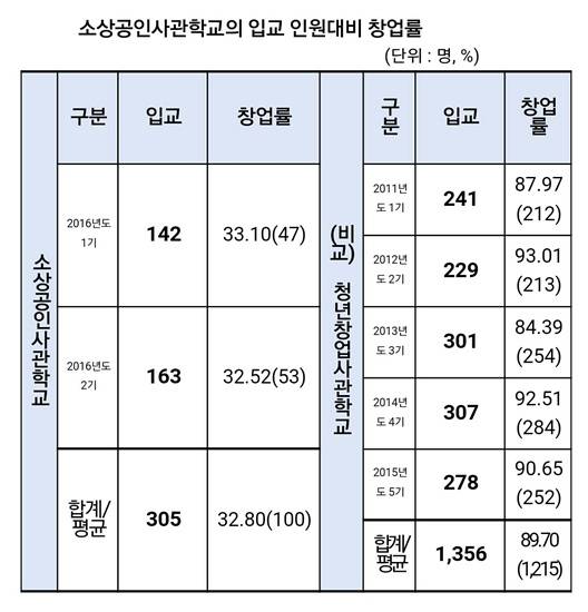 자료에 따르면 소상공인사관학교는 2016년도 1기의 경우 142명이 입교해 47명이 창업해 33.1%, 2016년도 2기의 경우 163명이 입교해 53명이 창업해 32.52%로 평균 32.8% 창업률을 나타내고 있다.