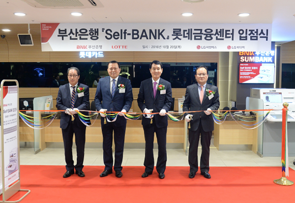 부산은행은 20일 오전 성세환 BNK금융 회장, 황각규 롯데 정책본부 운영실장(사장) 등 관계자들이 참석한 가운데 '셀프 뱅크 롯데금융센터(잠실)' 입점식을 가지고 본격 운영에 나섰다.