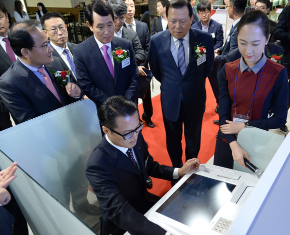 ▲성세환 BNK금융그룹 회장 및 관계자들이 롯데금융센터(잠실)에 설치된 'BNK스마트ATM' 시연 모습을 지켜보고 있다.