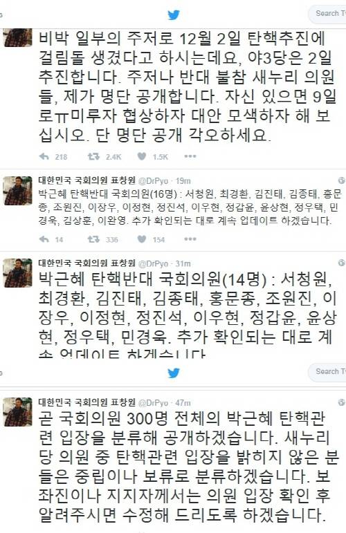 표 의원은 “비박 일부의 주저로 12월2일 탄핵추진에 걸림돌 생겼다고 하시는데 야3당은 2일 추진한다”며 “주저나 반대 불참 새누리 의원들 제가 공개한다. 자신 있으면 9일로 미루자, 협상하자, 대안보색하자 해보라. 단 명단 공개 각오할 것”이라고 주장했다.