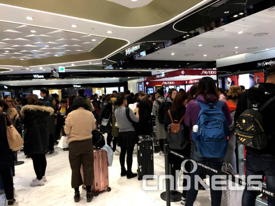 ▲지난 7일 롯데면세점 소공점 공진향후 매장 앞에서 길게 줄 서있는 중국인들. (사진=김유림 기자)