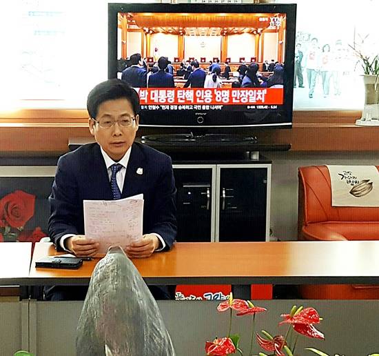 ▲더불어민주당 대선 경선후보인 최성 고양시장이 탄핵이 인용되는 순간 국정농단세력과의 대연정은 결코 안된다며 후보로서의 입장문을 발표하고 있다.(사진= 김진부 기자)