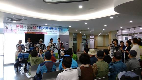 1층 어르신관 로비에서 열리는 이번 재능기부 콘서트는 지난주 이성애선생의 대금산조를 시작으로, 2차 17일은 평생학습원내 이현주 강사와 수강생이 함께하는 아코디언연주가 펼쳐졌다.